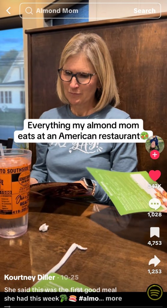 There are two parts to the almond mom phenomenon: those who see their mothers as almond moms and those who wish to be them, the almond daughters. The video above, to the left, showcases a daughter documenting what her almond mom eats at a run-of-the-mill American restaurant: a plate of sparse roasted vegetables and a portion size of grilled salmon. Being filmed from across the table, we all become witnesses to the consumption of her modest meal, and we are asked to judge her diet this day from the perspective that it is sparse and overly simplistic. We, the audience, are almost asked to make fun of her, or made to ask her, “Are you sure you’re full?”