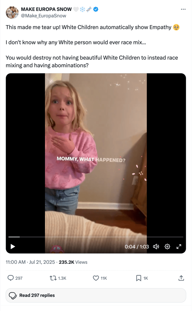 In the post above, shared by @Make_EuropaSnow, the partial caption “White Children automatically show empathy 🥹” is set against a TikTok/ Instagram Reel-type short-form compilation video of children comforting their family members. To begin, it begs the audience to equate whiteness with empathy, taking this video from its original context, whatever it may be, and placing it under a message promoting anti-miscegenation and white supremacy. A cute compilation of children doing things children do becomes a political tool, a prop, to promote a separatist, hateful ideology based on both the prospective identity of the viewer and the identity of these children.